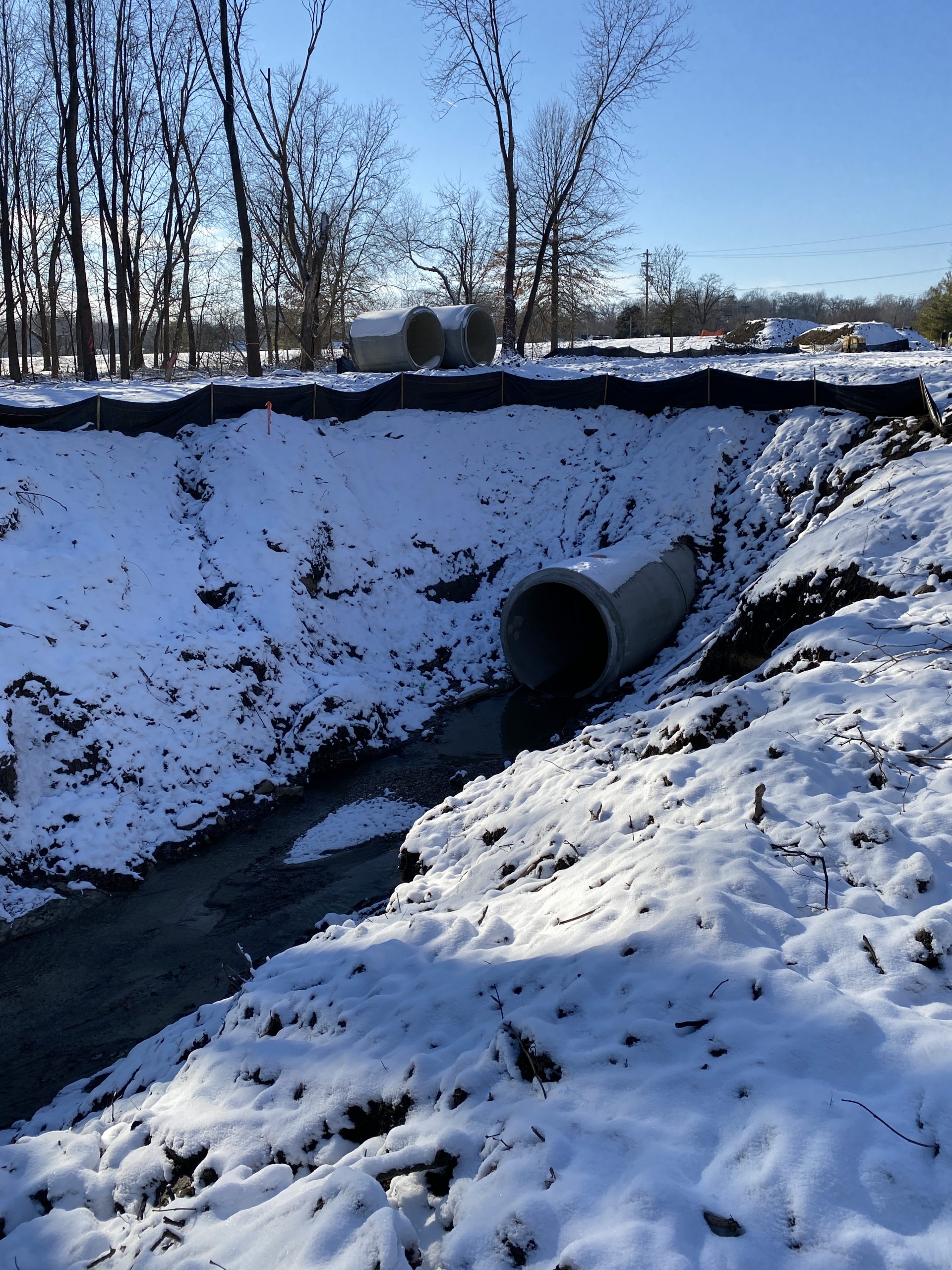 The project was broken into two separate projects to allow the flood gate, outfall, and levee work to begin while obtaining additional property owner agreement along the upstream project alignment.