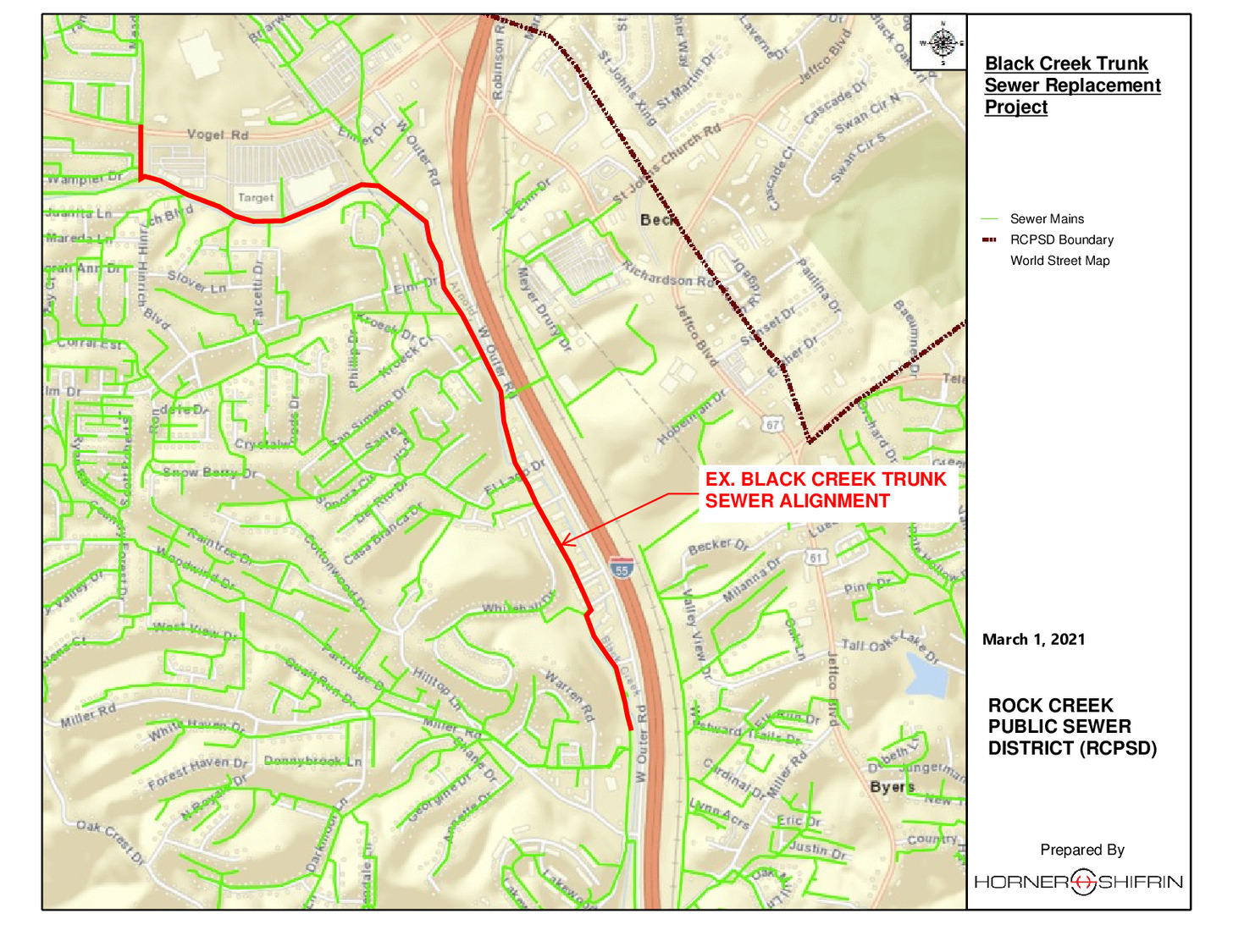 Horner & Shifrin partnered with the Jefferson County Public Sewer District to upgrade the Black Creek Trunk Sewer, a vital part of the region’s wastewater infrastructure. The project involves replacing nearly two miles of aging sewer line—from Vogel Road to Miller Road—with new, larger-diameter pipe to improve capacity and reliability for the community.