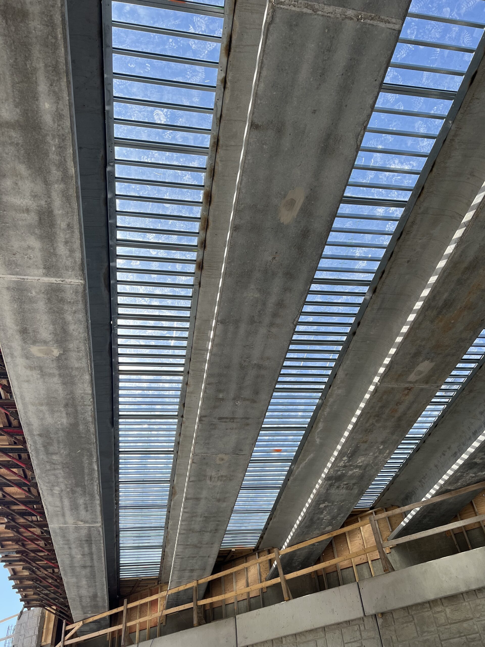 The bridge was constructed utilizing a transparent stay-in-place deck forming system, which allows the bridge deck to be observed by eye from below. This new construction practice is the result of years of research and development, resulting in an innovative method of deck forming that improves safety while complying with bridge inspection criteria. Anomalies and issues with deck pour or reinforcement can be easily spotted and rectified during construction, and the clear panels allow for the deck to be inspected by the naked eye for the life of the bridge.