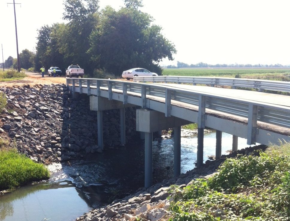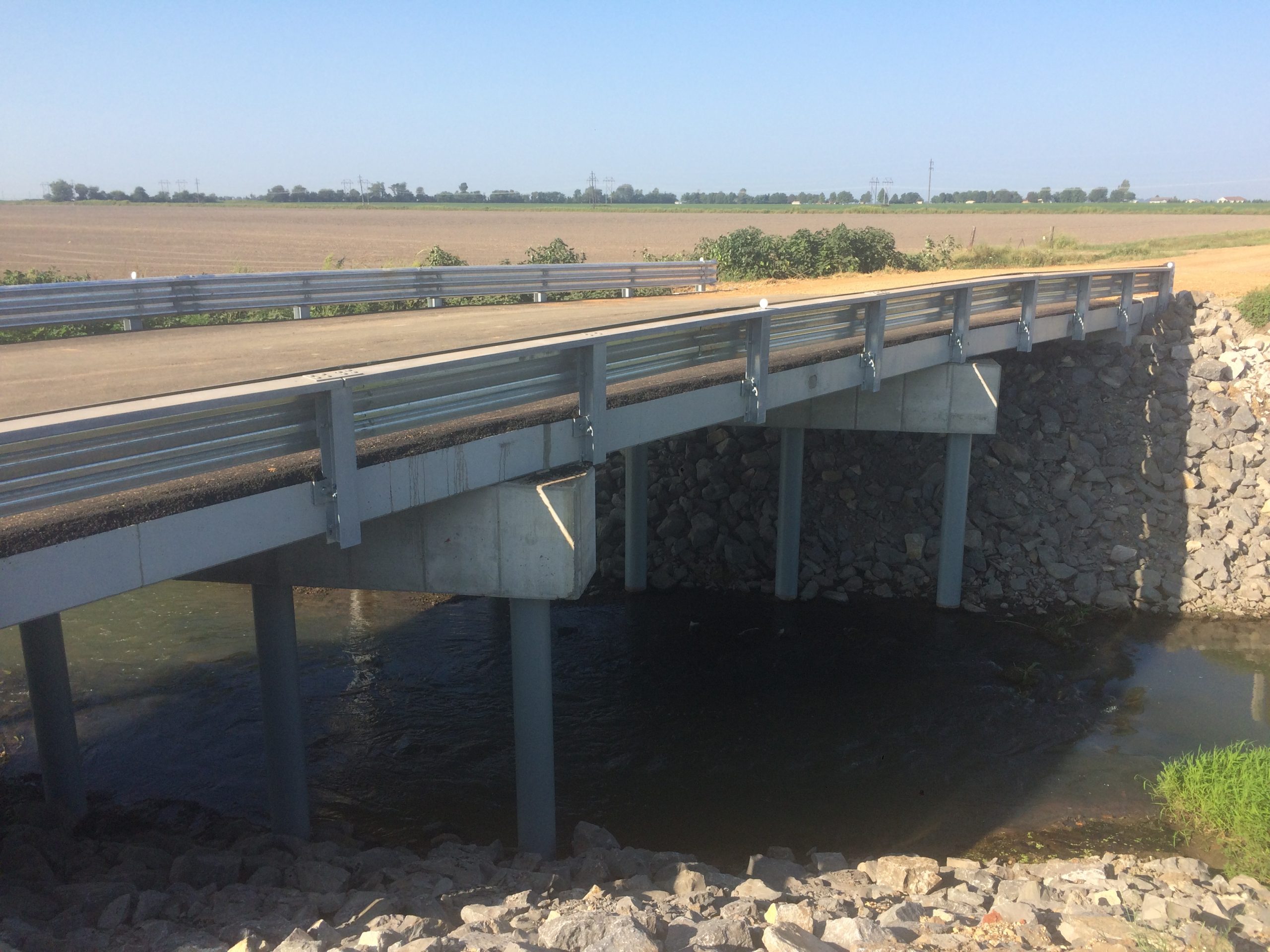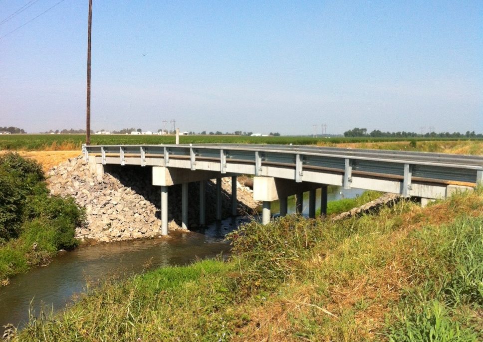 Horner & Shifrin provided design and construction engineering services for a replacement three-span 81-ft long bridge over Drainage Ditch No. 23. To minimize structure height and the need for profile adjustment due to hydraulics, final configuration was three 27-ft simple spans comprised of adjacent precast concrete C-beams with an asphalt wearing surface. The substructure was supported by 12-in diameter cast-in-place concrete piles. Low height barriers were provided to accommodate farm equipment. The project was constructed on a new alignment to eliminate a jog in the existing gravel road.