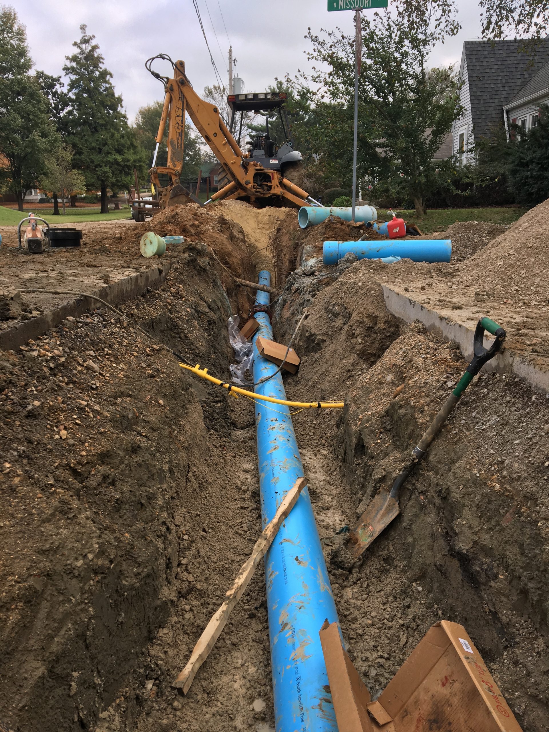 The design phase included detailed plan and specification development, easement preparation, utility coordination, and Corps of Engineer and MODOT permit approvals. The project also included easement preparation, bidding phase services, construction phase services, full-time inspection, and as-built survey as the main was being constructed.