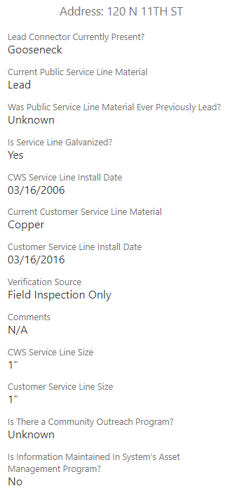 The process starts with a review of existing records, such as construction documents and as-built drawings, to map out areas where the material of service lines is already known and highlight locations where it’s still unknown. For those unknown areas, inspectors visit properties to check the type of service line material. During these visits, inspectors use tablets or smartphones to record details, take photos, and map the service line’s path from the house to the water main—all within the secure, cloud-based Skyview GIS system.