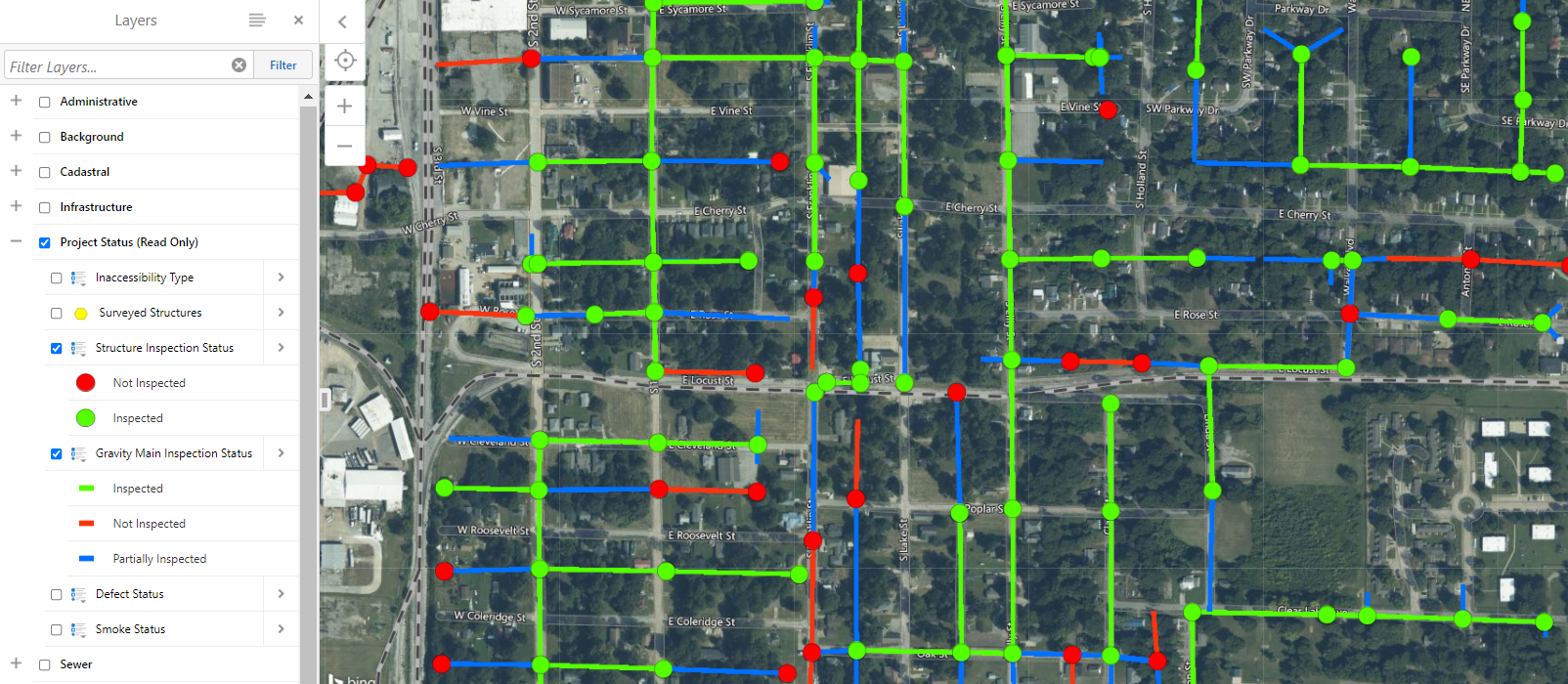 H&S conducted smoke testing on over 500,000 linear feet of gravity sewer lines. Public and private defects and possible I/I locations were documented and entered into the GIS database system. Mobile devices linked to the web-based GIS were used to collect location, data, and photographs of defects in real-time. Specific sewer reaches were identified, a sub-consultant CCTV crew gathered additional detail from visual pipe inspections and the CCTV inspection video and PDF reports were added to the web-based GIS to provide direct access for PMI and the City staff to the data.
