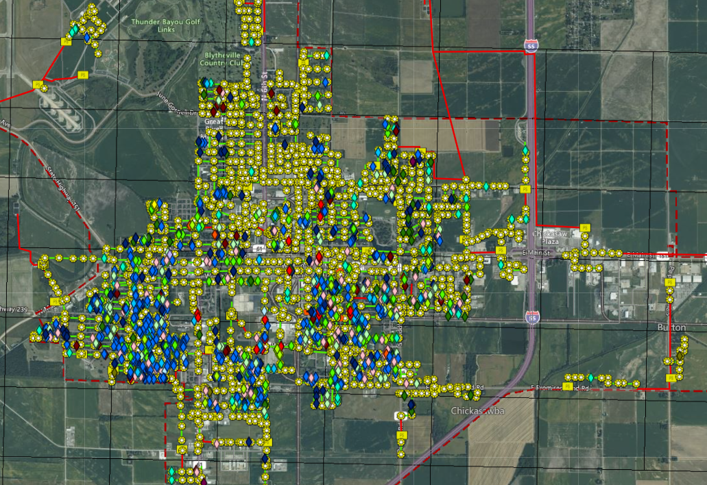 Pollution Management Inc. and the City of Blytheville, AR retained Horner & Shifrin to complete an extensive smoke testing of the entire sanitary sewer system including I&I investigation involving structure inspection, condition assessment, and video inspection of selected portions of the system. In addition, GIS asset collection and website deployment were included in the scope of work. H&S developed a secure web-based GIS application and database of system attributes (location, sizes, physical condition, etc.) and performed data migration of existing sewer system drawing files into the GIS system. The team conducted survey-grade GPS survey of 200+ structures including manholes, pump stations, air release valves, and valve vaults. Survey data was integrated into the GIS to create a District wide sewer map and integrated with online aerial data. H&S conducted approximately 200+ detailed manhole inspections utilizing NASSCO standards to collect physical dimensions, structural conditions, and sources of possible I/I. Mobile devices linked to the web-based GIS were used to collect all data, inspection notes, and photographs in real-time providing up to the minute data and status of structures. Utilization of real-time data allowed for additional coordination with PMI and City staff to coordinate additional efforts in the event of extreme I&I situations.