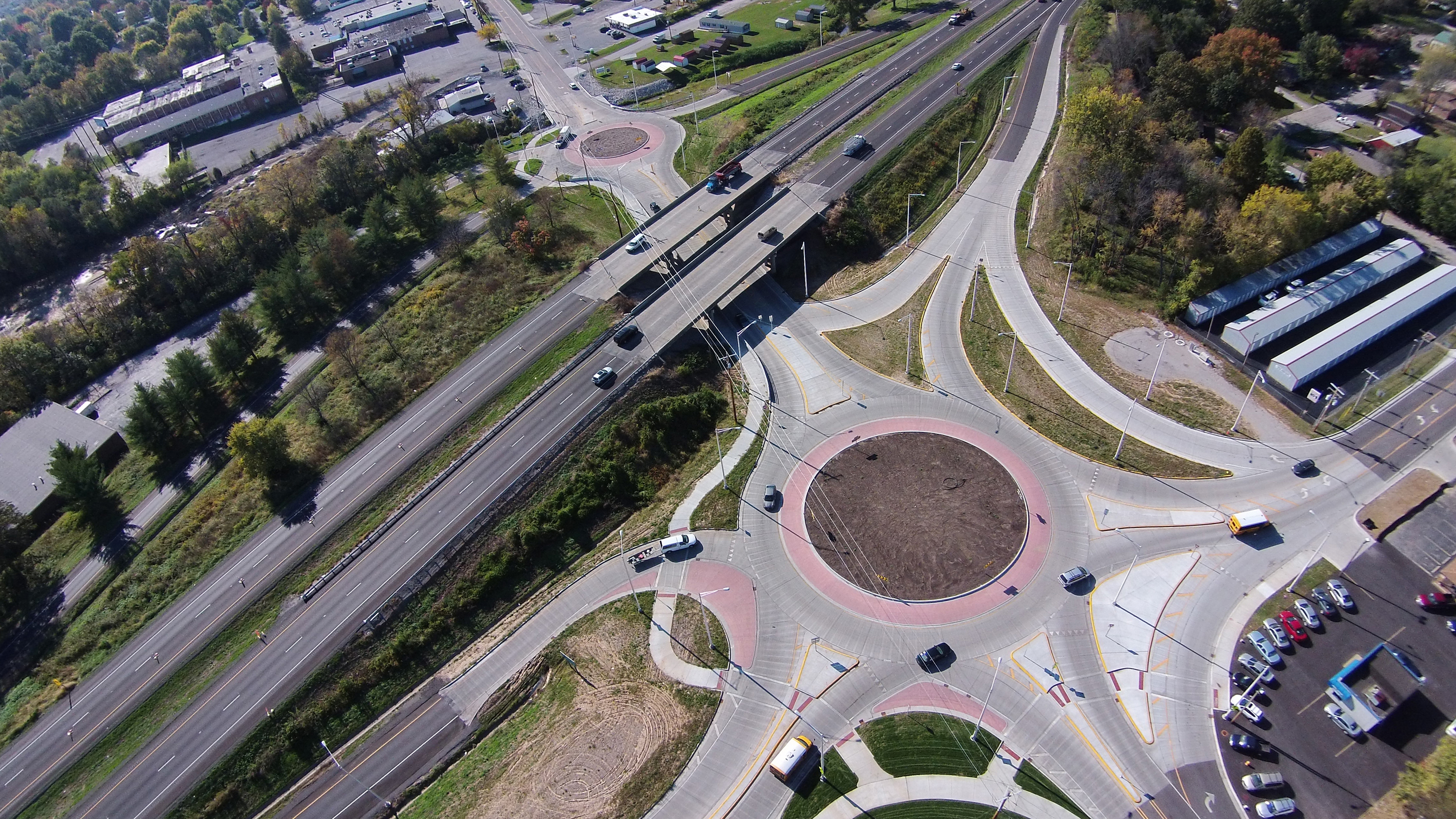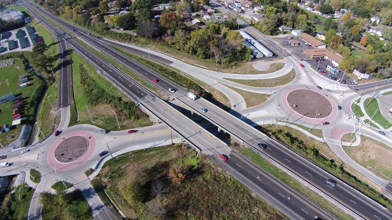 Horner & Shifrin prepared Phase I and Phase II plans for the reconstruction of the IL 15 / IL 158 interchange in Belleville, IL, including the nearby intersection of IL 158 and IL 13. The end result is the replacement of three signalized intersections with two roundabouts. The northern roundabout has six legs of traffic and combines three state routes and eliminates two closely spaced signalized intersections which were the cause of traffic congestion in the area. A complex traffic staging plan, consisting of several stages of construction and an on-site detour, allowed the project area to be open to traffic while the roundabouts were constructed. A concrete barrier wall was designed integral with the adjacent pavement to provide the appropriate level of crash protection for the shared-use path, located immediately adjacent to the traffic lane and under the IL 15 structures.