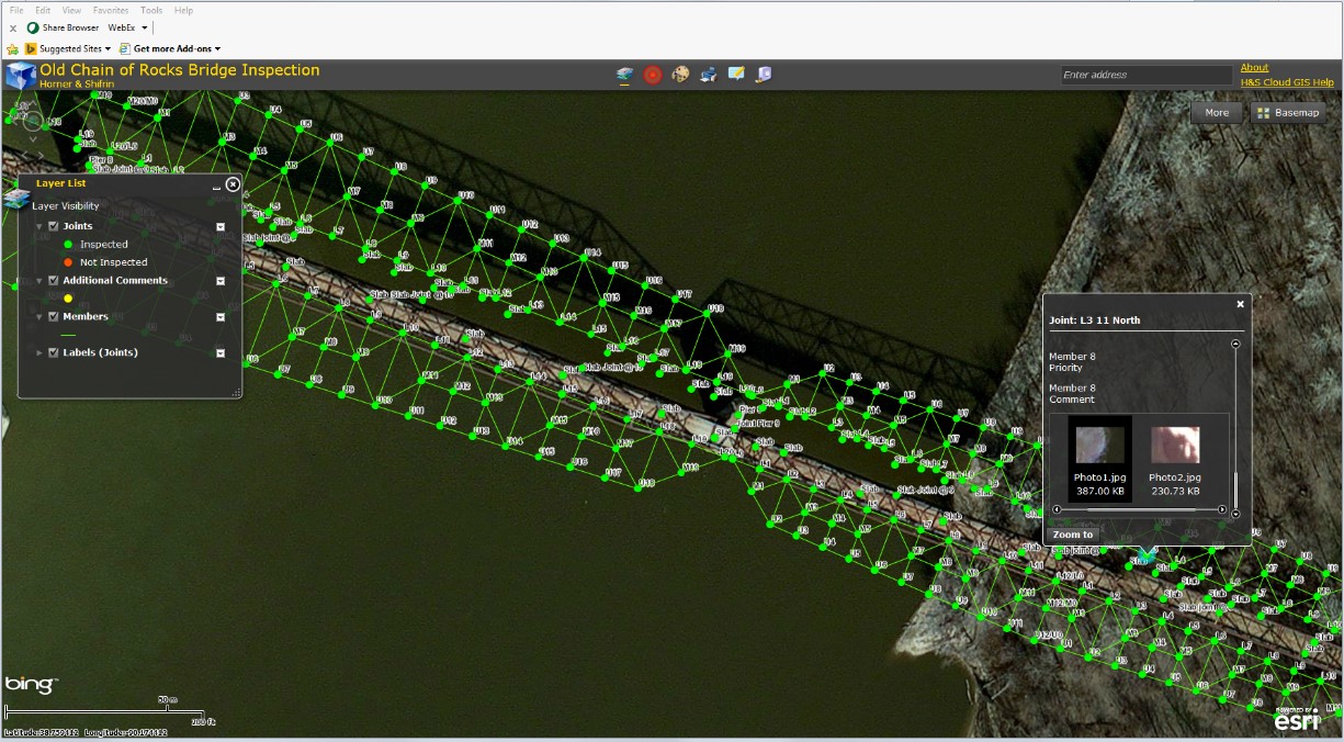 Horner & Shifrin completed an in-depth safety inspection of the bridge using hanging scaffold and manlifts to provide arm’s length access.  H&S was able to reach areas of the bridge that had not been inspected in decades. Inspection notes were collected in our Cloud Hosted GIS system which allowed real-time sharing of notes and photos in a web- and map-based system and detailed reporting of problems.