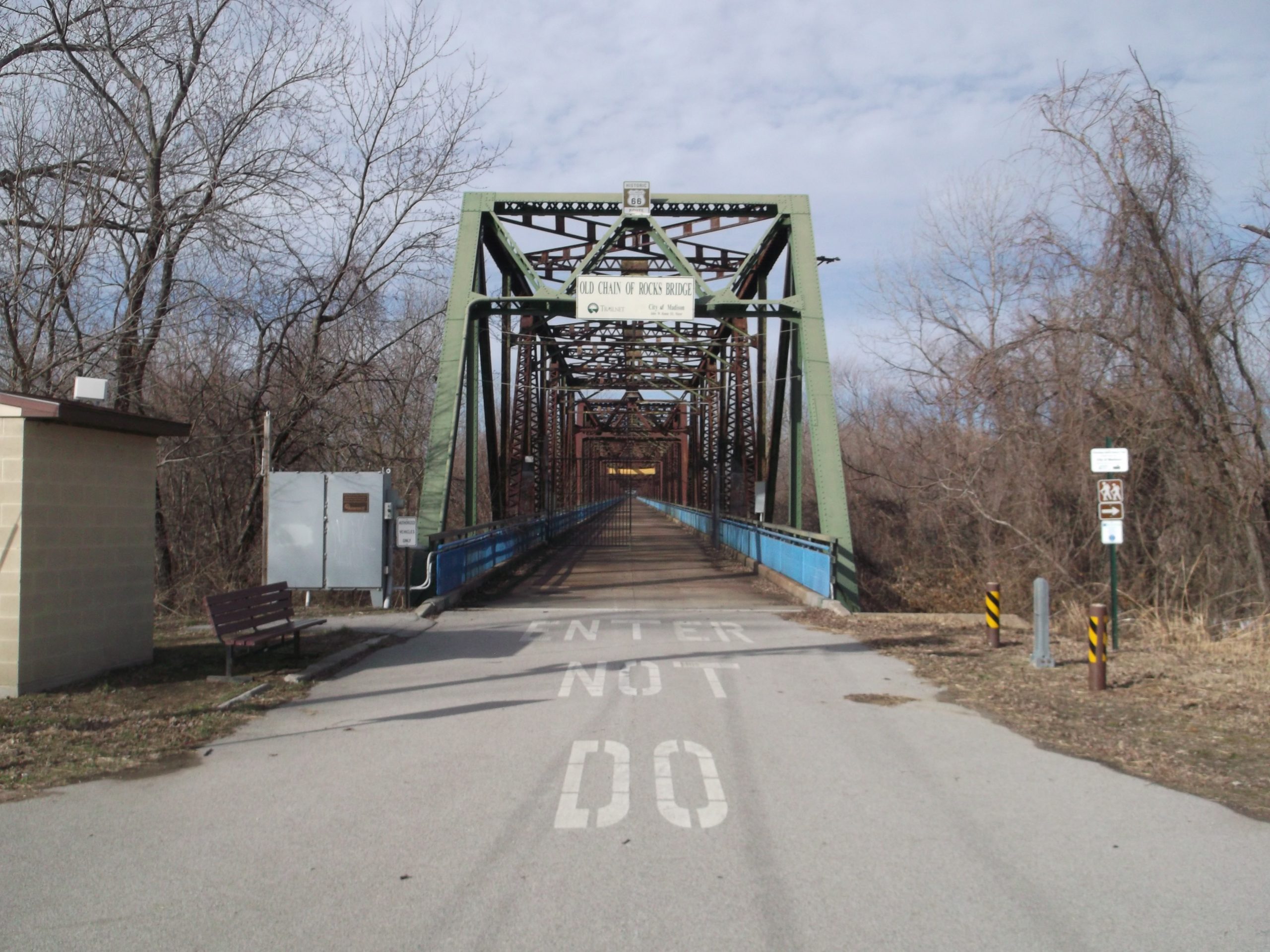 The 16 span, mile-long Old Chain of Rocks Bridge currently serves to carry a multi-use trail over the Mississippi River in North St. Louis.  The bridge was constructed in 1929 and closed to vehicular traffic in 1970 before re-opening as a trail bridge in the 1990s.  The bridge is on the National Register of Historic Places due to its affiliation with historic Rte. 66.