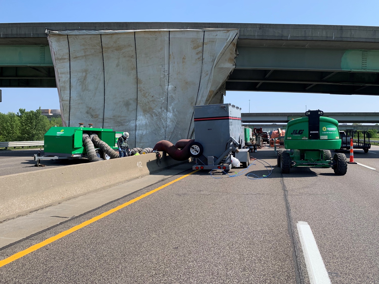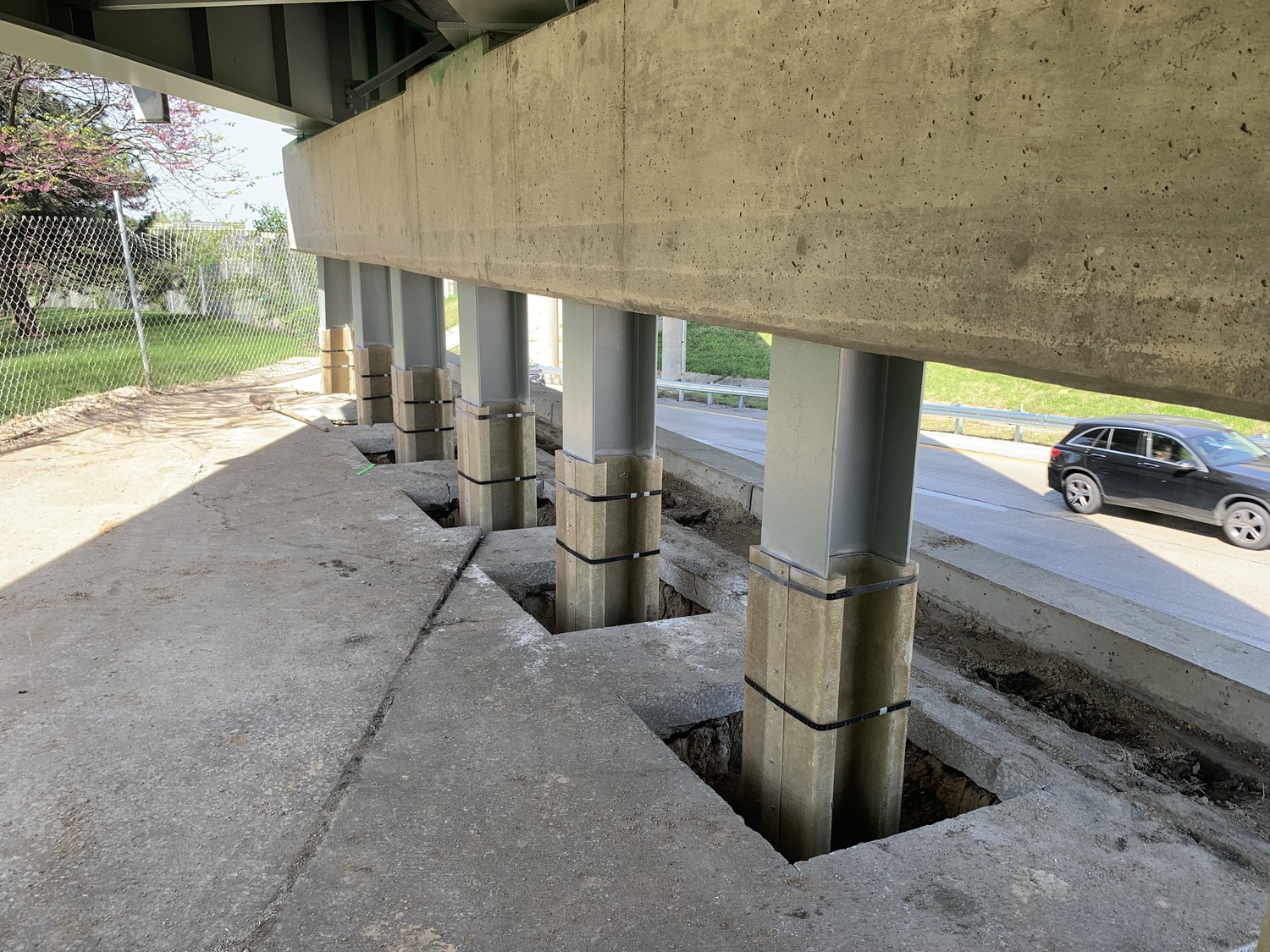 Horner & Shifrin provided full time construction inspection for all three phases of construction. This project consisted of rehabilitation of 8 bridges at the I-64 and I-270 interchange. There was 89,900 SQFT of steel surface preparation with three coats of system G paint, 250,000 SQFT of surface preparation for over coat with two coats of system G paint. After half-sole repairs were completed 31,280 SQYD’s of epoxy urethane polymer wearing surface was applied. A total of 2,3058 LF of slotted drain were removed and replaced at two locations. The roadway had 33,307 LB of hot polymer concrete patching for partial depth repair with 683 SQYD of full depth pavement repair. Total MGS guardrail installed was 8,075 LF, 19 EA MGS bridge transitions sections and 9 Type A crashworthy end terminals. The project also included numerous ITS items along with a CCTV installation.