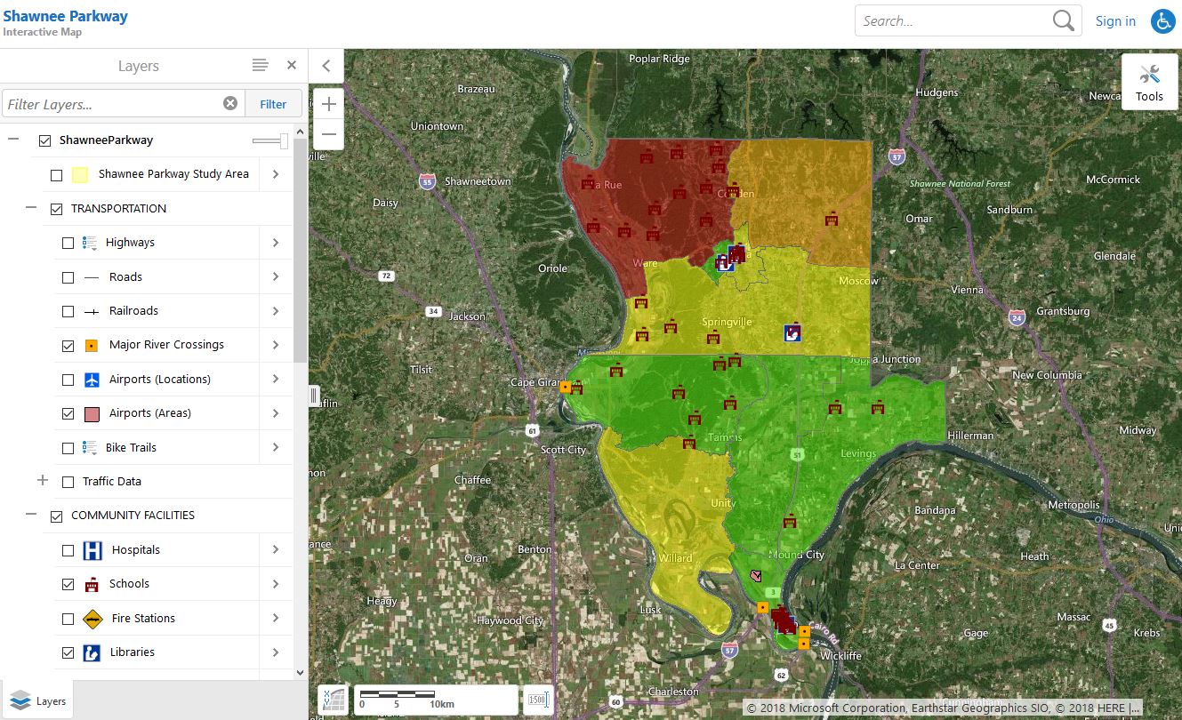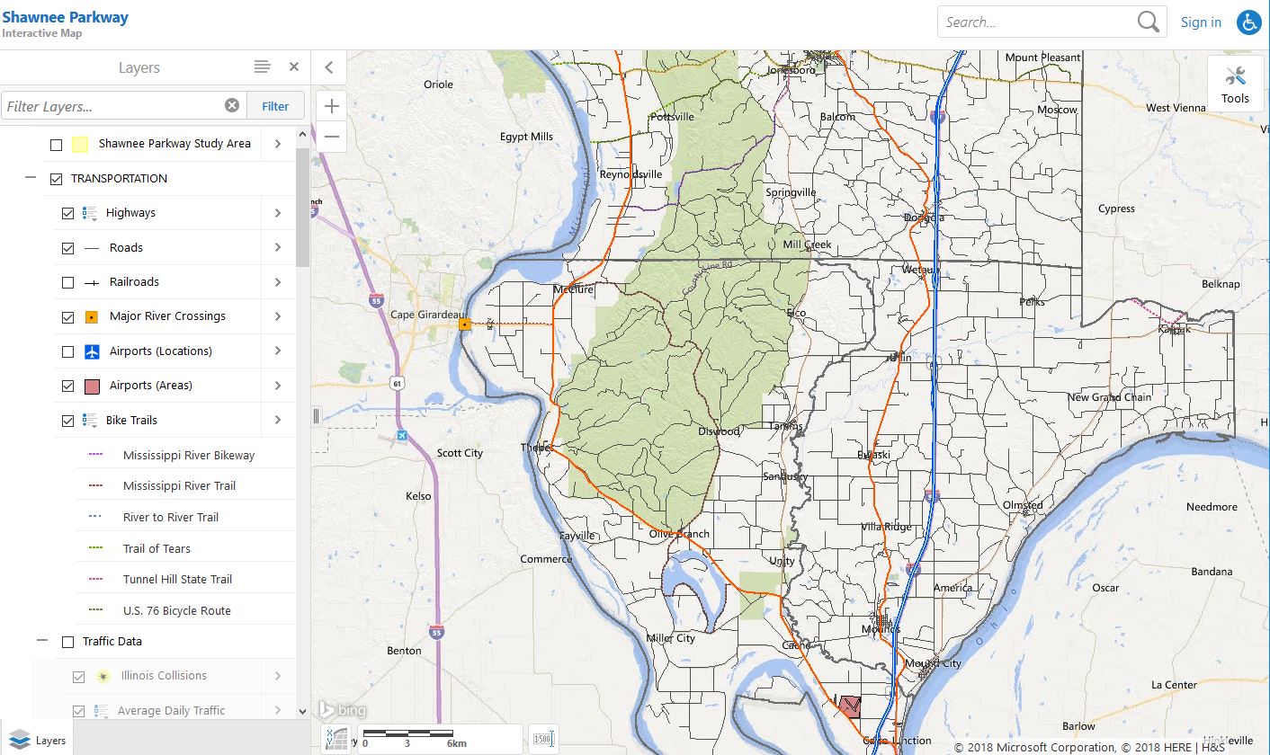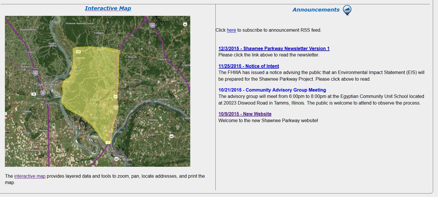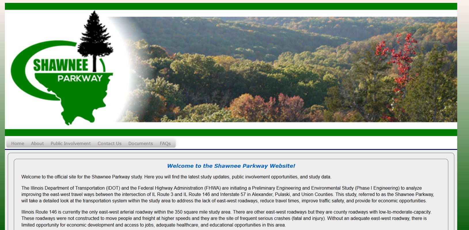 Horner & Shifrin was selected by IDOT to complete an Environmental Impact Statement for a new transportation facility improving the east-west travel ways through the Shawnee National Forest in the Illinois counties of Alexander, Pulaski, and Union. This study, referred to as the Shawnee Parkway, required detailed look at the transportation system within the study area to address the lack of east-west roadways and provide for economic opportunities. This study was initiated after the IDOT U.S. 66 Corridor study which was to assess transportation improvements from Kentucky through southern Illinois to Missouri was unsuccessful due to lack of neighboring state participation.