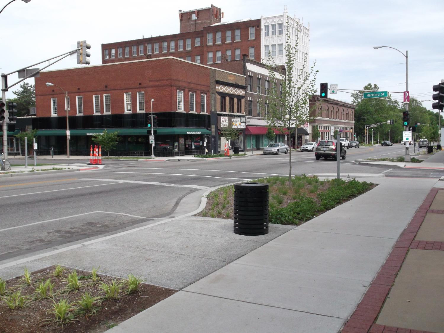 Improvements included reducing traffic lanes from four to three, widening sidewalks, improved traffic signalization for flow and calming, enhanced safety of crosswalks with bulb-outs, ADA ramps and striping, adding landscaping, site furnishings and lighting, and upgrading paving to eliminate hazards in walkway.