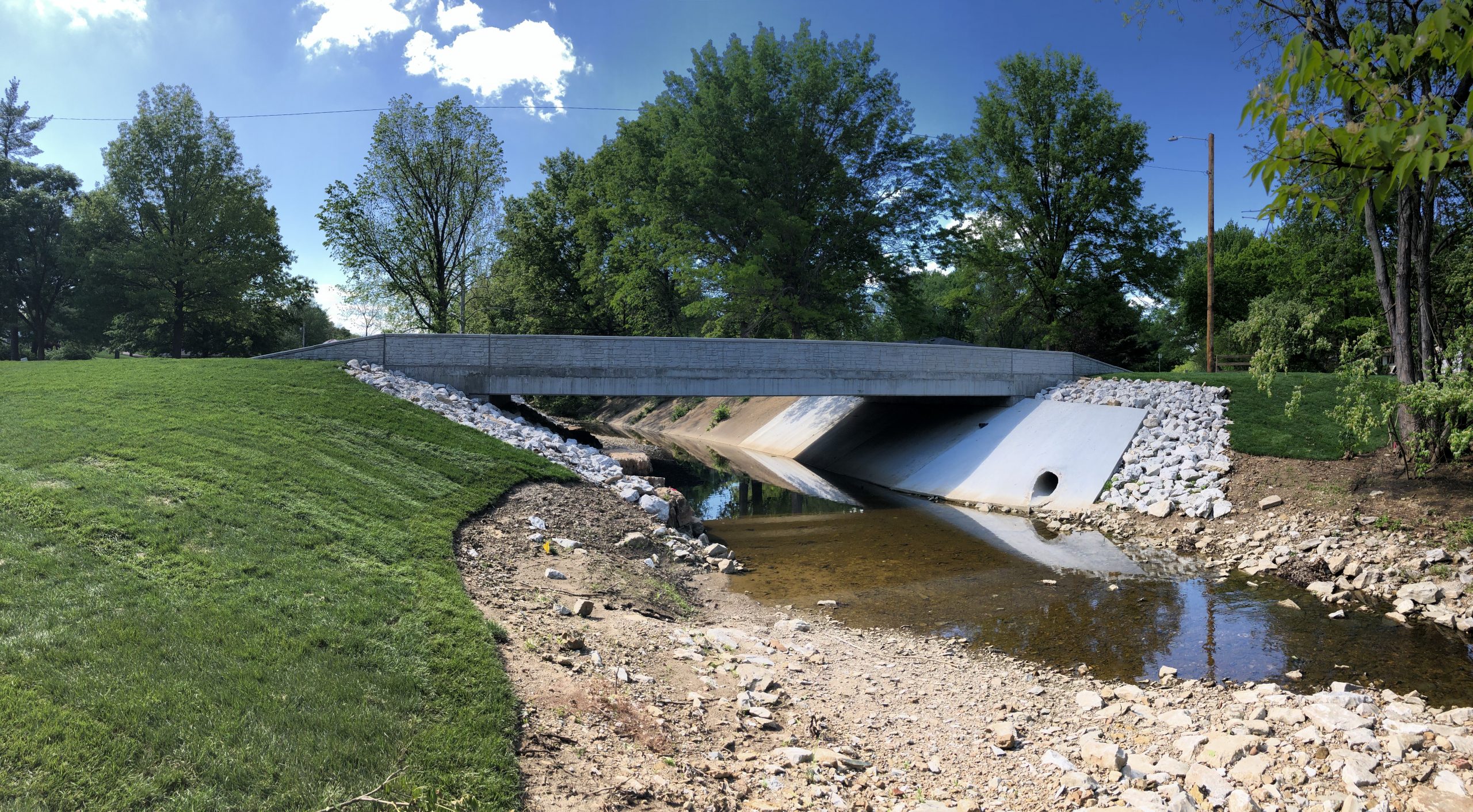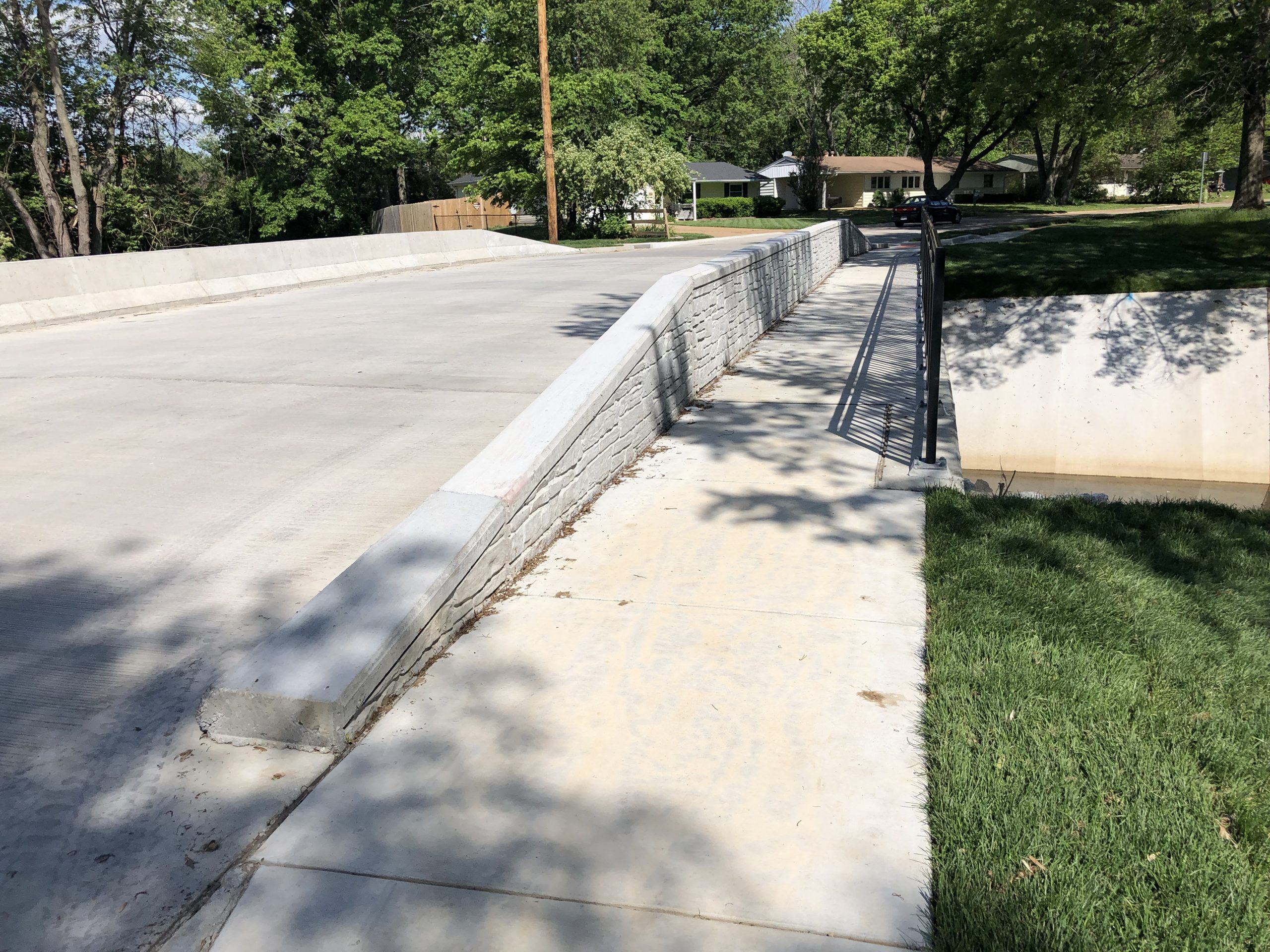 Horner & Shifrin performed the design and construction engineering for a replacement bridge carrying Spring Meadows Drive over Grand Glaize Creek for the City of Manchester.  This project included federal funding.  The new 58-ft long single span structure utilizes 21-inch prestressed precast concrete spread box beams with a full depth concrete slab.  The substructure consists of concrete integral end bents supported by steel h-piles.  The project includes extending an existing sidewalk across the bridge to Baxter Road.  Raising the roadway profile resulted in the need to rebuild the driveway and parking lot for nearby Baxter Acres Park.  H&S utilized a slab boulder wall under the south end of the bridge and stabilized the creek face adjacent to the park with new riprap.