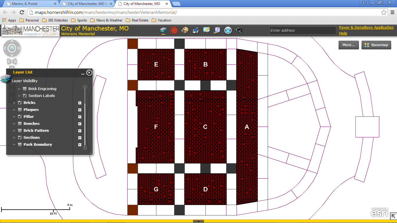 The City of Manchester, MO retained our services for developing and implementing a comprehensive Geographic Information System (GIS) with a focus on the management of Veteran’s Memorial Brick Paver Program. Horner & Shifrin had the challenge to create brick paver application from existing paper map drawings and excel file data with no set paver pattern. Our solution provided the City of Manchester, MO staff to modify locations of 8”x8” or 4”x8” brick pavers based on a 4” grid pattern. Donors and public users can search GIS records for location by brick number or by engravings on the individual bricks and view photos of bricks.