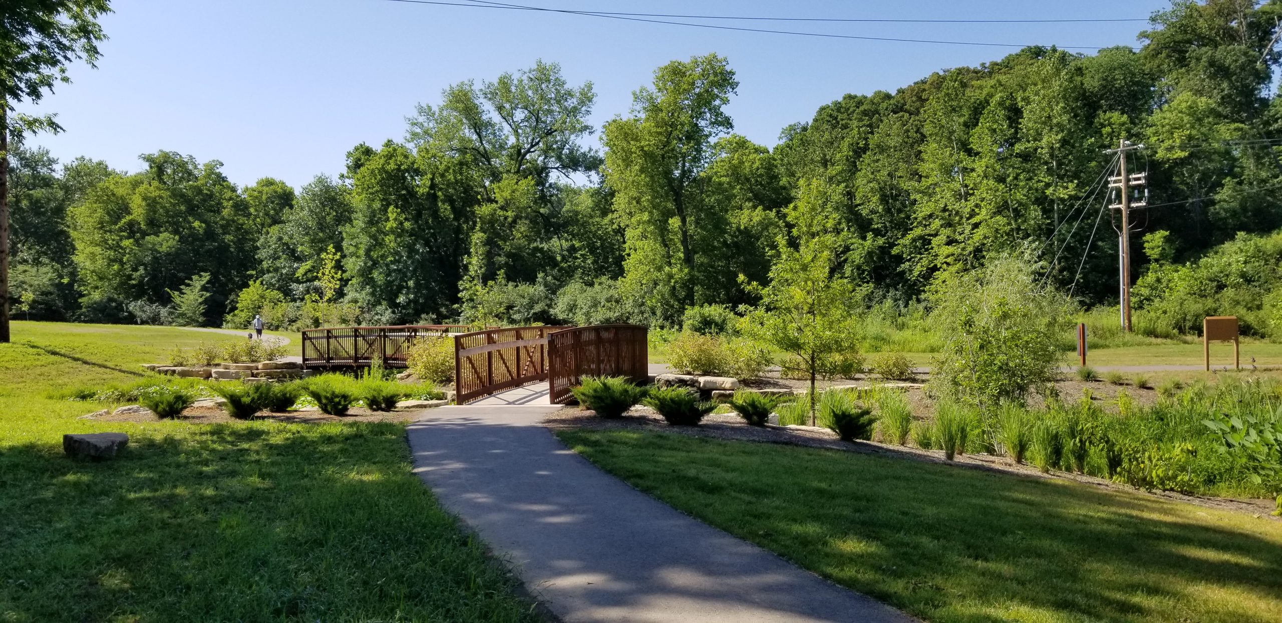 Bridge design services included foundation design for three pre-fabricated steel truss bridges, plans for a Contech pre-fabricated concrete bridge and rehabilitation of an old farm road bridge. The bridges had aesthetic elements including fences and ledge rock finishes.
