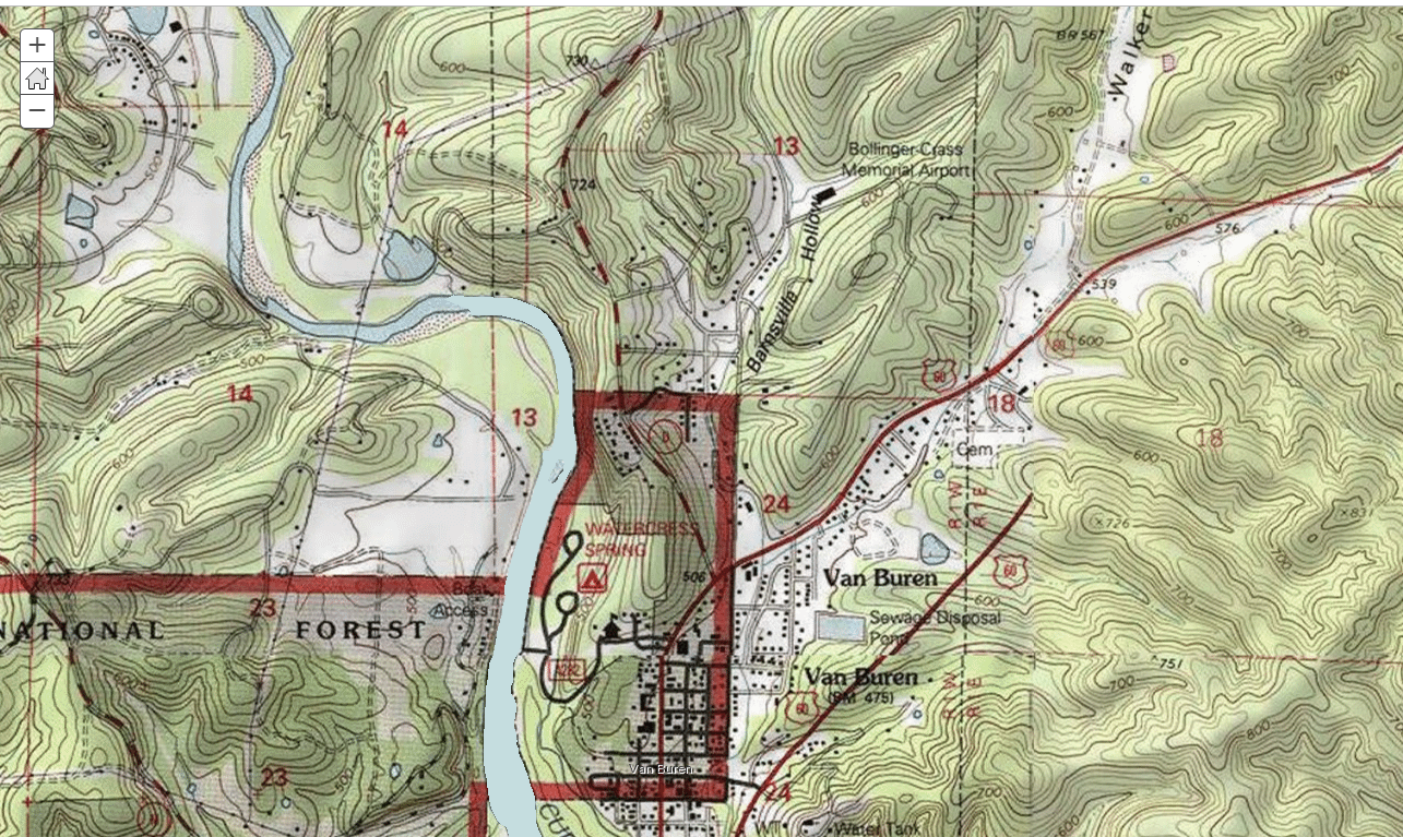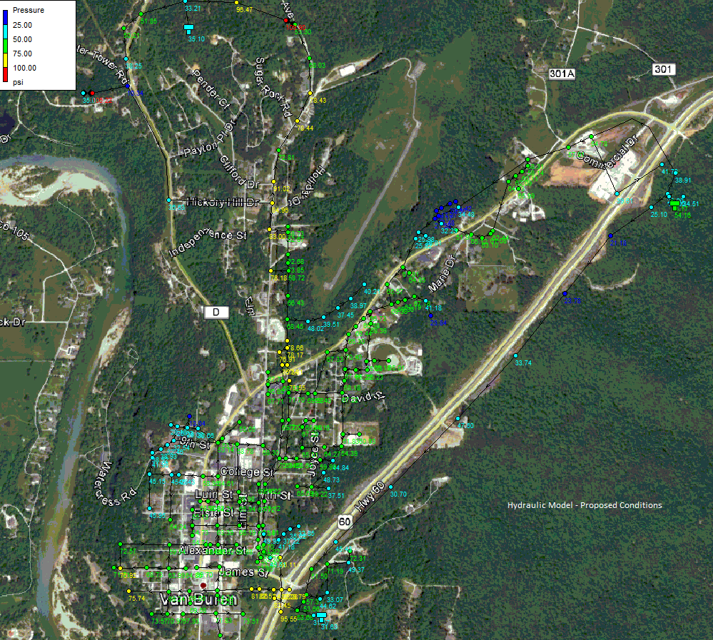 Horner & Shifrin developed a facility plan that reviewed Van Buren’s drinking water system. The City’s system was plagued by low pressure areas, well/wellhouse/controls located below local floodplain elevations, and in need of replacement linework in a variety of areas. The report recommended constructing approximately 3.5 miles of new water lines, new valves, new flush hydrants, two new groundwater source wells with well houses, a new 250,000 gallon elevated water storage tank, and a 60,000 gallon standpipe. The improvements were needed to provide better pressure and flow to the significant changes in relief across the town as well as an appropriate amount of water storage capacity. New water supply wells, complete with well houses and chlorination systems, are required to supply the proposed water storage tanks. With this arrangement, the City will have a back-up power source for its water supply source in an area that is not susceptible to flooding.