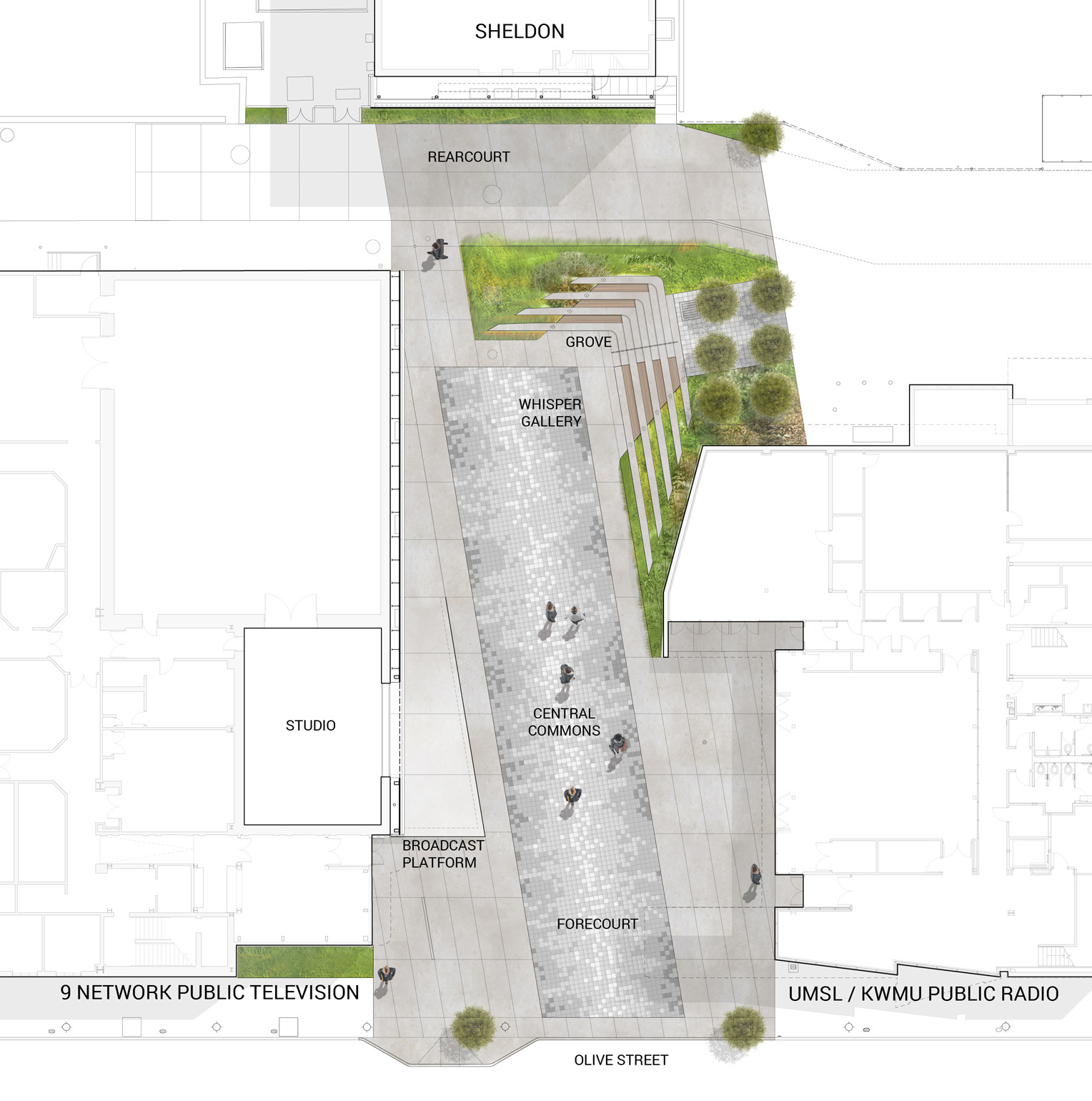 Horner & Shifrin provided electrical design and construction services for the 15,000 square foot outdoor studio at the intersection of Grand Boulevard and Washington Avenue. The Public Media Commons, dubbed the “white room” during the design process due to its all-white façade, runs predominantly north to south from Olive Street. The plaza includes a forecourt entry, a central gathering space with an elevated café terrace or stage, a shady hangout, and landscaping. Steps integrated into the Commons and leading toward the Fox Theatre create ample seating for the viewing of a large media screen. The programmable LED uplighting is splashed against white, perforated aluminum walls. The surfaces invite a diversity of media expression, from touch screens to large-format projection, and QR patterns incorporated at various intervals along them link the physical facades with the virtual space of media and visitors’ mobile devices.